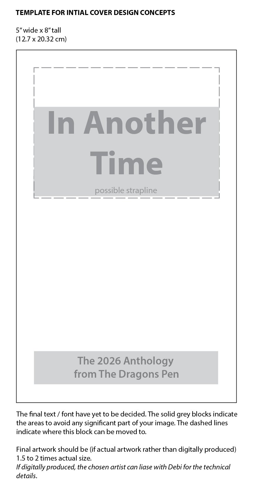 - Cover design - final submission by December 31st, 2025. The designs will be voted on by members of the association. A gallery of all cover designs will be added to this website. The chosen designer will receive one free copy of the book. They will be credited with the cover design within the book. for any artists wanting to submit illustrations for the Anthology, please do you artwork larger than published size - please send an email to debi@dragonspen.com for full specifications. You can also see the specifications here For a template of the cover to help with your cover design concept please click here